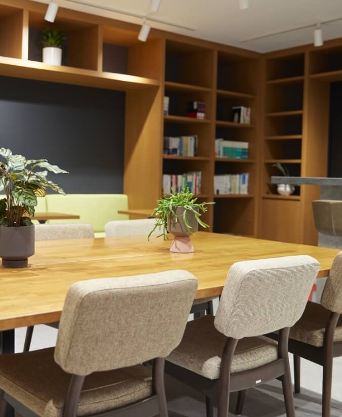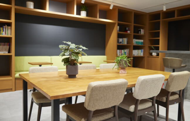 図書館の中のカフェをイメージ。ランチやお茶でホッと一息つきたい時、豊富な書籍から仕事のヒントや学びを得たい時、軽いミーティングをしたい時など幅広く活用できます。