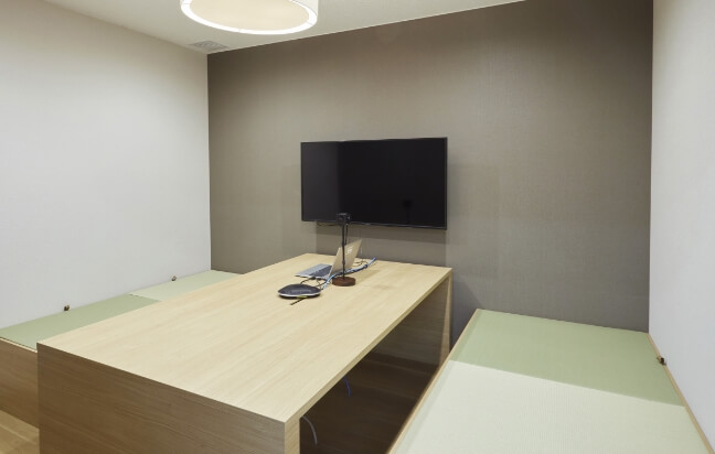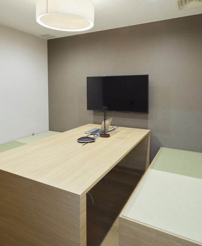 重厚な木目調の部屋や、オープンなガラス張り、ゆったり座れるコの字型ソファー、くつろげる畳敷。会議室としてだけでなく休憩室やワークスペースとしても応用できる空間です。